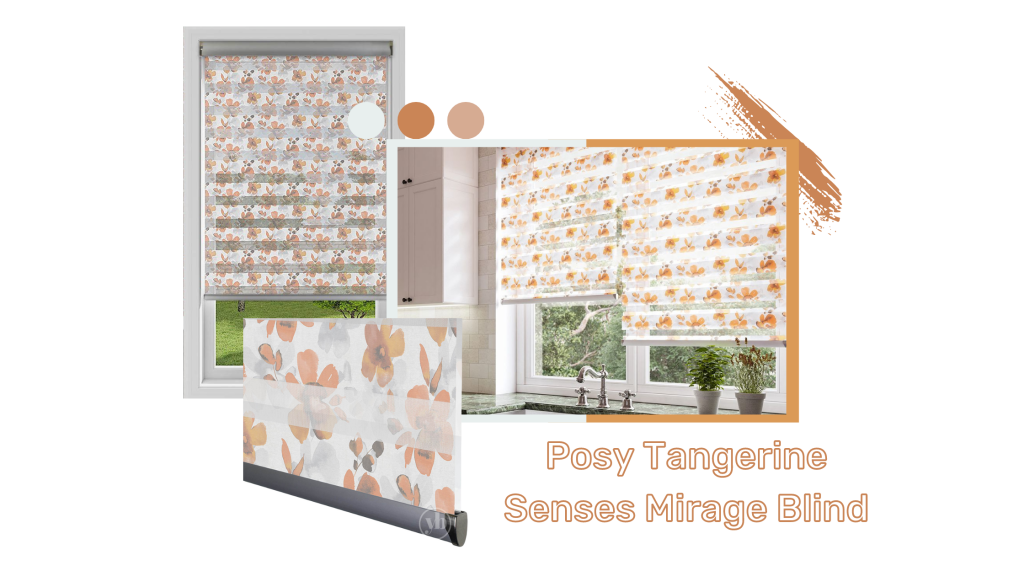 Complement your space with our unique Posy Tangerine Senses Mirage Blind. The fabric is in a light grey colour and features a beautiful floral pattern in orange and brown shades. Perfect for living rooms, dining rooms and kitchens, this blind will add a unique accent to any space. Style it with one of the available headrail options for a customized look. Combining an excellent light control with a stylish design, it’s a beautiful blind with maximum functionality.