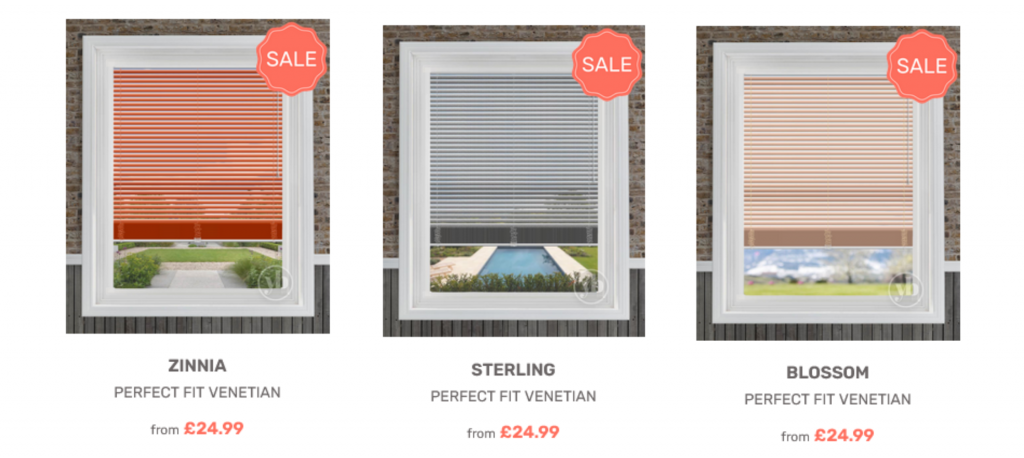 Lastly, spring sale option 3, our made to measure Perfect Fit Venetian blinds. Easy to install as the blind can be clipped into a UPVC window frame. The blind comes with all the necessary brackets so you can easily fit it into your window straight away. Venetian blinds are great for privacy and light control. The blind is operated by a wand to fully control the amount of light coming into the room